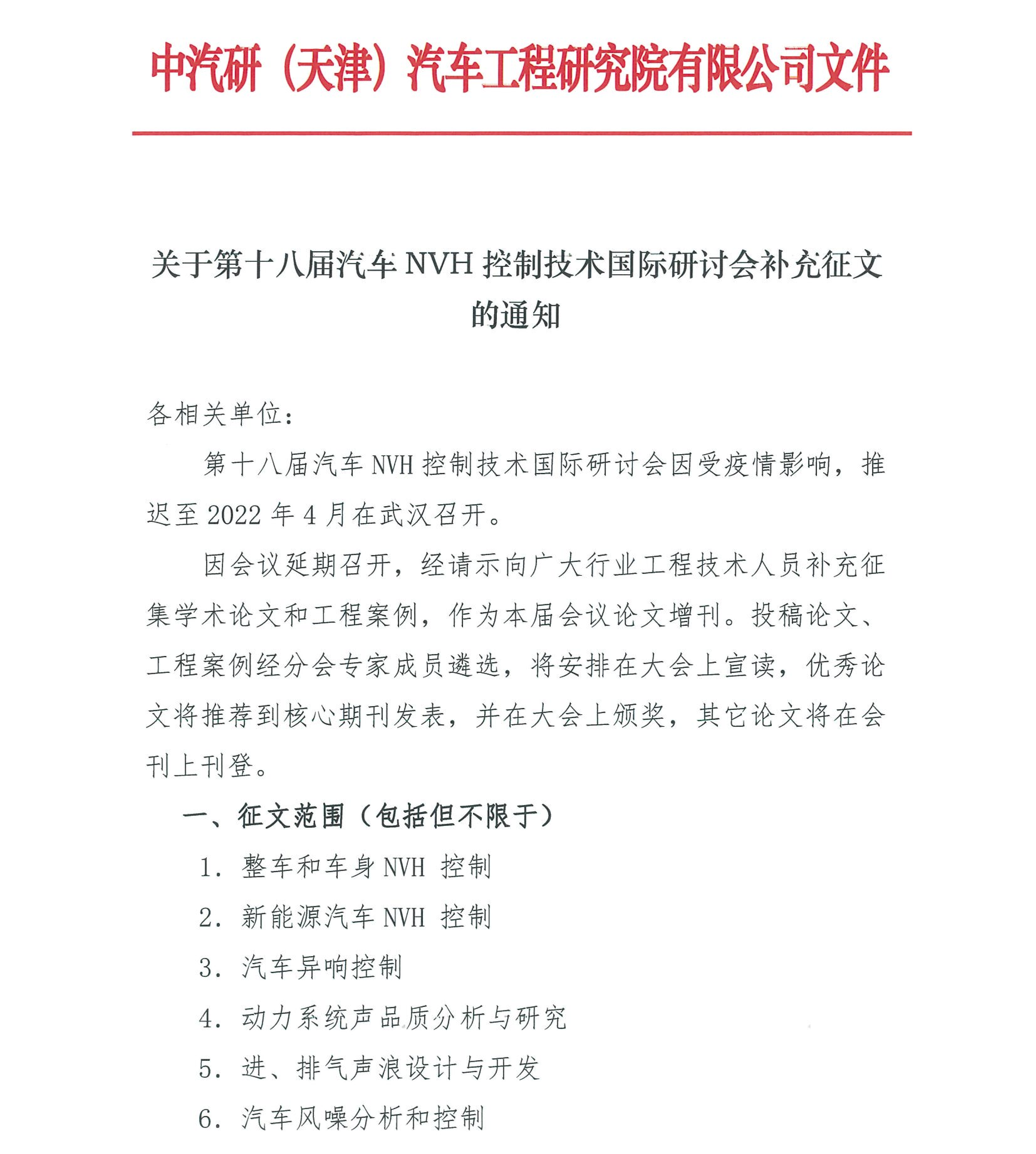 關(guān)于第十八屆汽車NVH控制技術(shù)國際研討會(huì)補(bǔ)充征文的通知