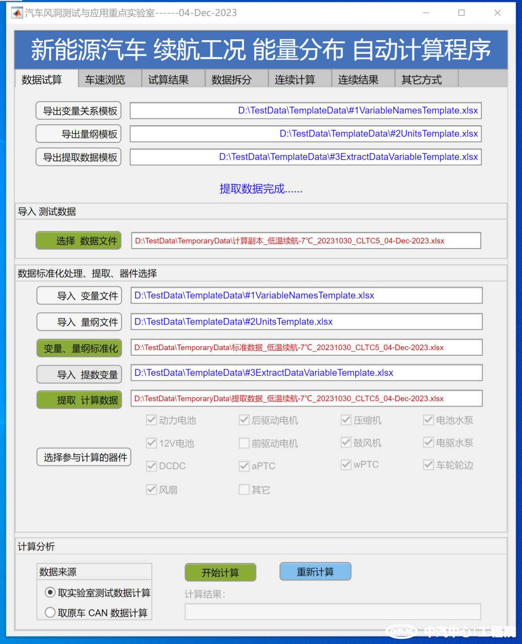 作為產品需求分析、市場定位分析的重要環節,對標(Benchmark)測試是常用手段。根據行業里對整車熱系統控制對標測試分析的需要,風洞測試與應用重點實驗室開發團隊已經掌握了各種情況下的CAN、LIN通訊協議的解析能力,還具備了外加測試通道實測相應性能數據的能力。基于此,開發團隊具備了新能源汽車熱系統及動力總成系統能耗測試并對測試數據進行自動分析計算的能力和分析整車熱系統控制的功能、性能并得到Benchmark解析報告的能力(能量流可自動計算分解到續航工況下的每一個循環的每一個器件)。