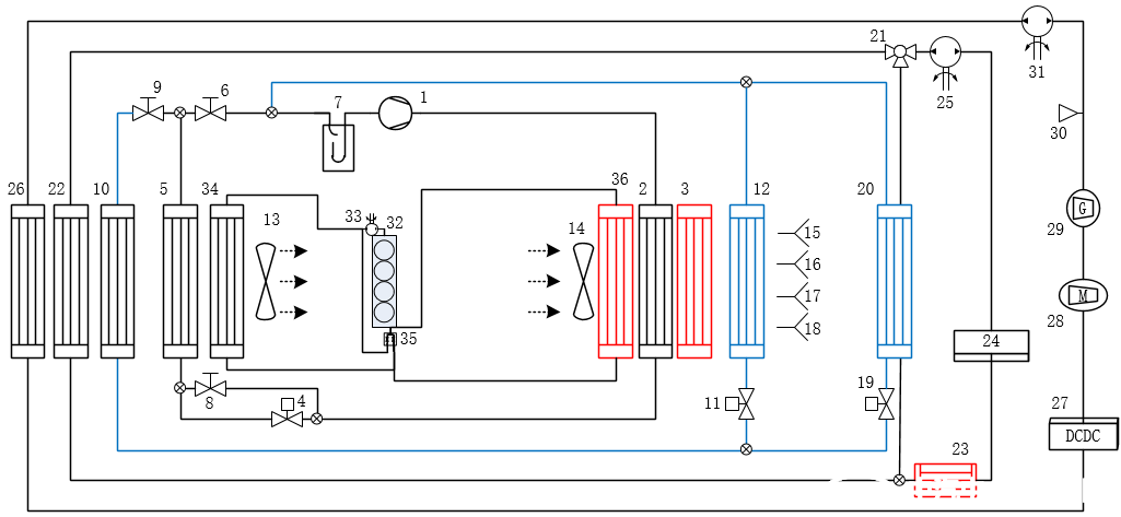 根據待開發整車的設計空間布局、電池電驅系統的配置及其性能標準、乘員艙的制冷和制熱需求、主動及被動冷卻和余熱利用的工作模式,以及參照Benchmark測試數據庫的數據或對比數據,進行熱系統總布置的設計構建符合要求的熱系統構型。