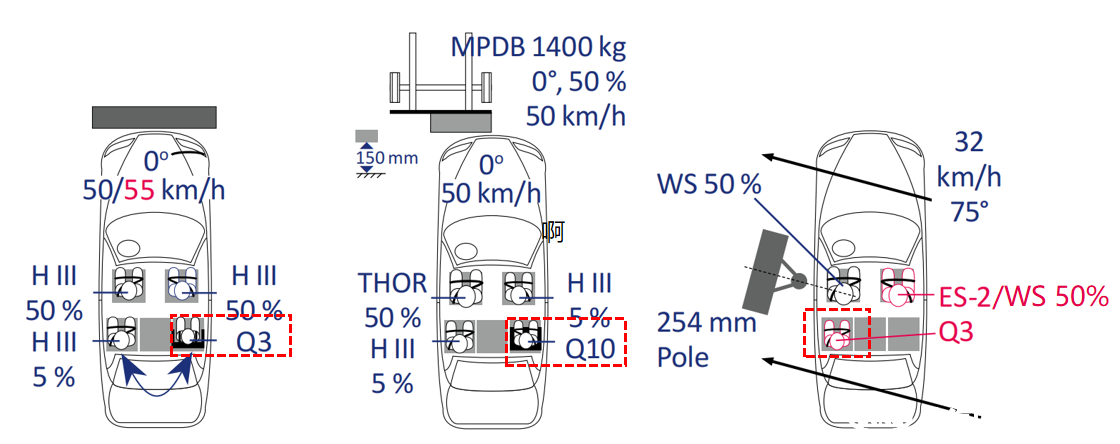 • 側(cè)柱碰對Q3假人進行評價,其安裝方式與正碰有相關(guān)性,影響正碰兒童座椅安裝朝向的選擇以及評價指標(biāo)的選擇,這就需要關(guān)注正碰和側(cè)柱碰的相容性問題。