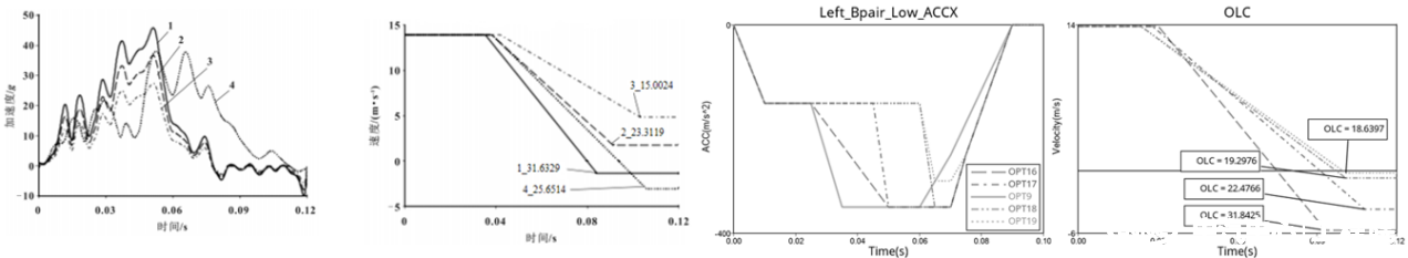 動態(tài)仿真開發(fā)方面,針對正碰碰撞速度提升問題,分析加載脈沖變化,重點解析加載脈沖幅值-波寬-時刻對假人傷害的影響情況,以備針對不同車型進行專項優(yōu)化分析。