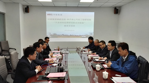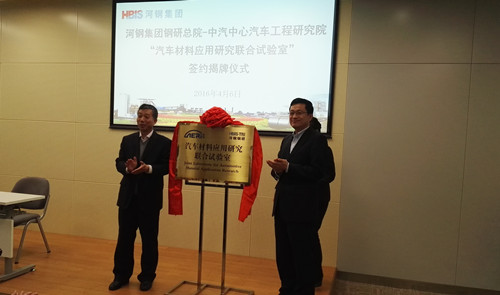 2016年4月6日,中國汽車技術研究中心汽車工程研究院(以下簡稱“中汽中心工程院”)與河鋼集團鋼鐵研究總院(以下簡稱“河鋼鋼研總院”)成立“汽車材料應用研究聯(lián)合試驗室”簽約和揭牌儀式在河鋼集團總部會議室舉行。參加此次儀式領導有河鋼集團副總經(jīng)理王新東、河鋼鋼研總院院長李建新、河鋼鋼研總院副院長吝章國、副院長常金寶和河鋼集團唐鋼技術中心、河鋼集團邯鋼技術中心相關領導,以及中汽中心工程院高繼東院長、謝書港主任、胡濟民主任、孟憲明博士。