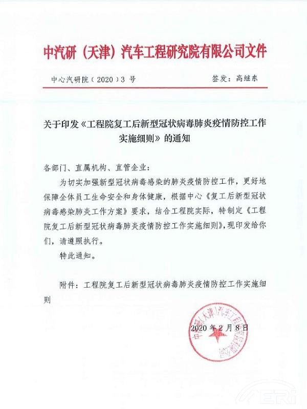 2月8日,發(fā)布《工程院復(fù)工后新型冠狀病毒肺炎疫情防控工作實(shí)施細(xì)則》,從人員復(fù)工、交通工具乘坐、個人防護(hù)、入院區(qū)防護(hù)、辦公防疫、就餐防疫、體溫檢測工作、各場所消毒工作、單身公寓防疫、客戶來訪、外來物品管理等11個方面對復(fù)工后防疫工作進(jìn)行了全面、系統(tǒng)地部署。